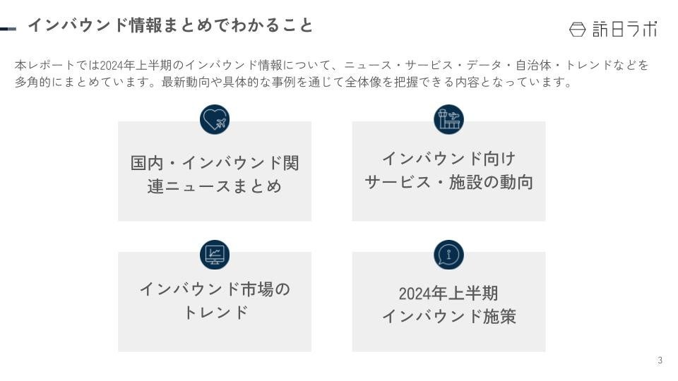 「国内・インバウンド関連ニュースまとめ」「インバウンド市場のトレンド」「2024年上半期インバウンド施策」など、インバウンド担当者必見の情報を1本のレポートに凝縮!