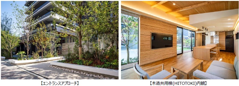 本物件は高度築特例許可の取得により31mの高さ制限を43mに緩和し、建物を高層化したことで事業性を確保しながらも空地率約40%、緑地率約20%の「余白」を創出し、商店街沿いの街並みにゆとりと木々の木漏れ日を生み出しました。敷地内には国産木材を使用した木造の共用棟「HITOTOKI」を設置し、木のぬくもりを感じられる内装としつつ、中庭に面した縁側空間を設けました。