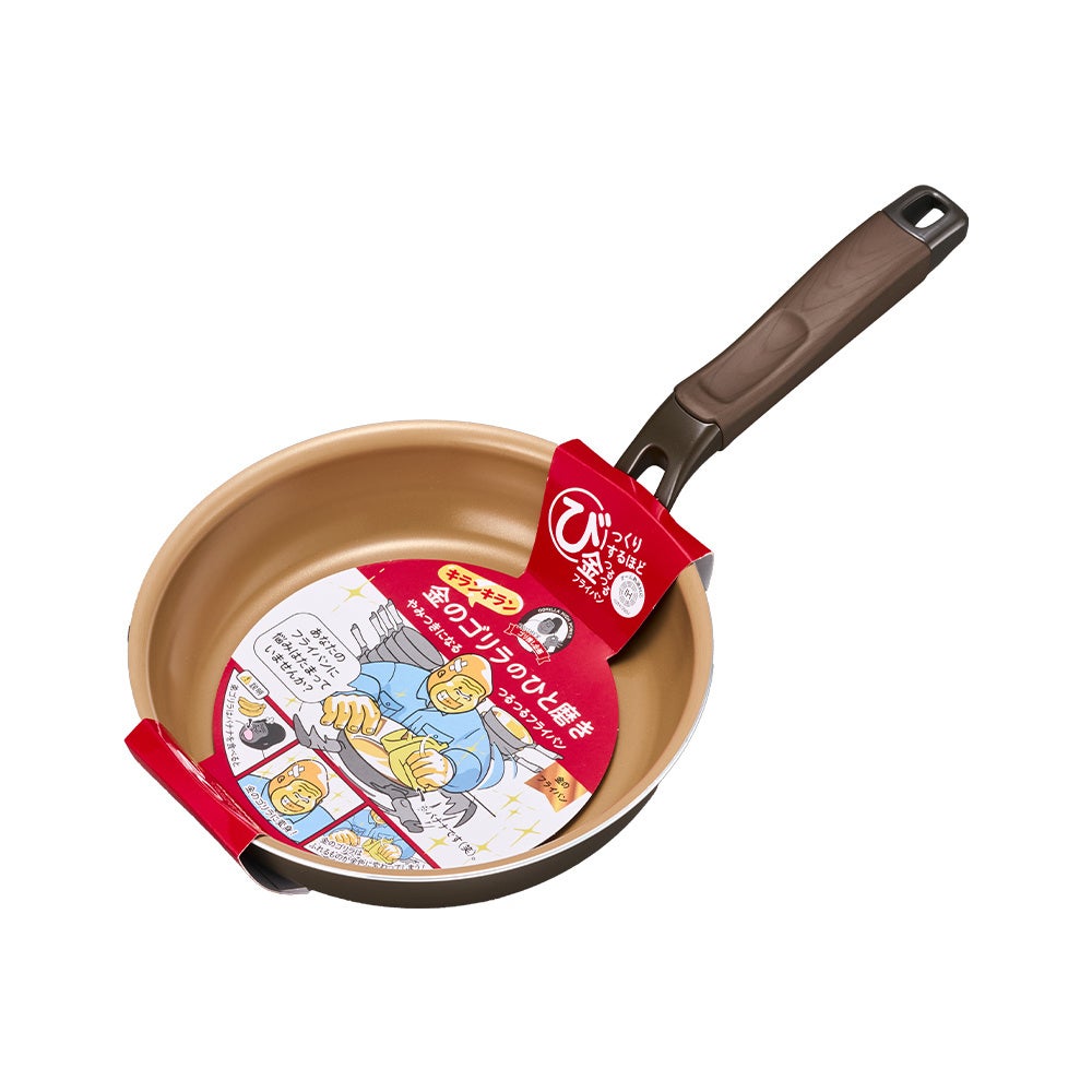 本製品は、ゴリラのキャラクターがフライパン工場でアルバイト中にバナナを食べ、“金のゴリラ”に変身したという設定をもとにしています。金のゴリラがバナナでフライパンを磨いた結果、つるつるの金色フライパンになってしまった、というストーリーから生まれた、表面がつるつるなフライパンです。