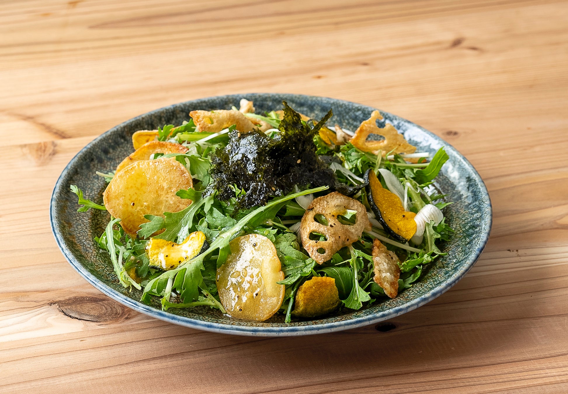 4種の秋野菜チップスと新鮮な生の春菊を自家製の柚子塩麴ドレッシングでお召し上がりください。