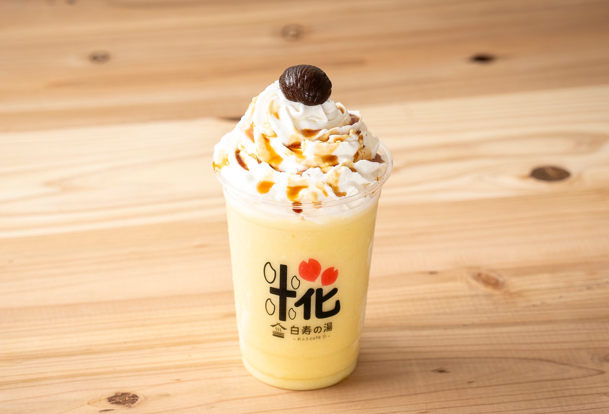 程よい甘さの甘酒シェイクに濃厚な栗のペーストを入れて、マロングラッセをトッピングしました。