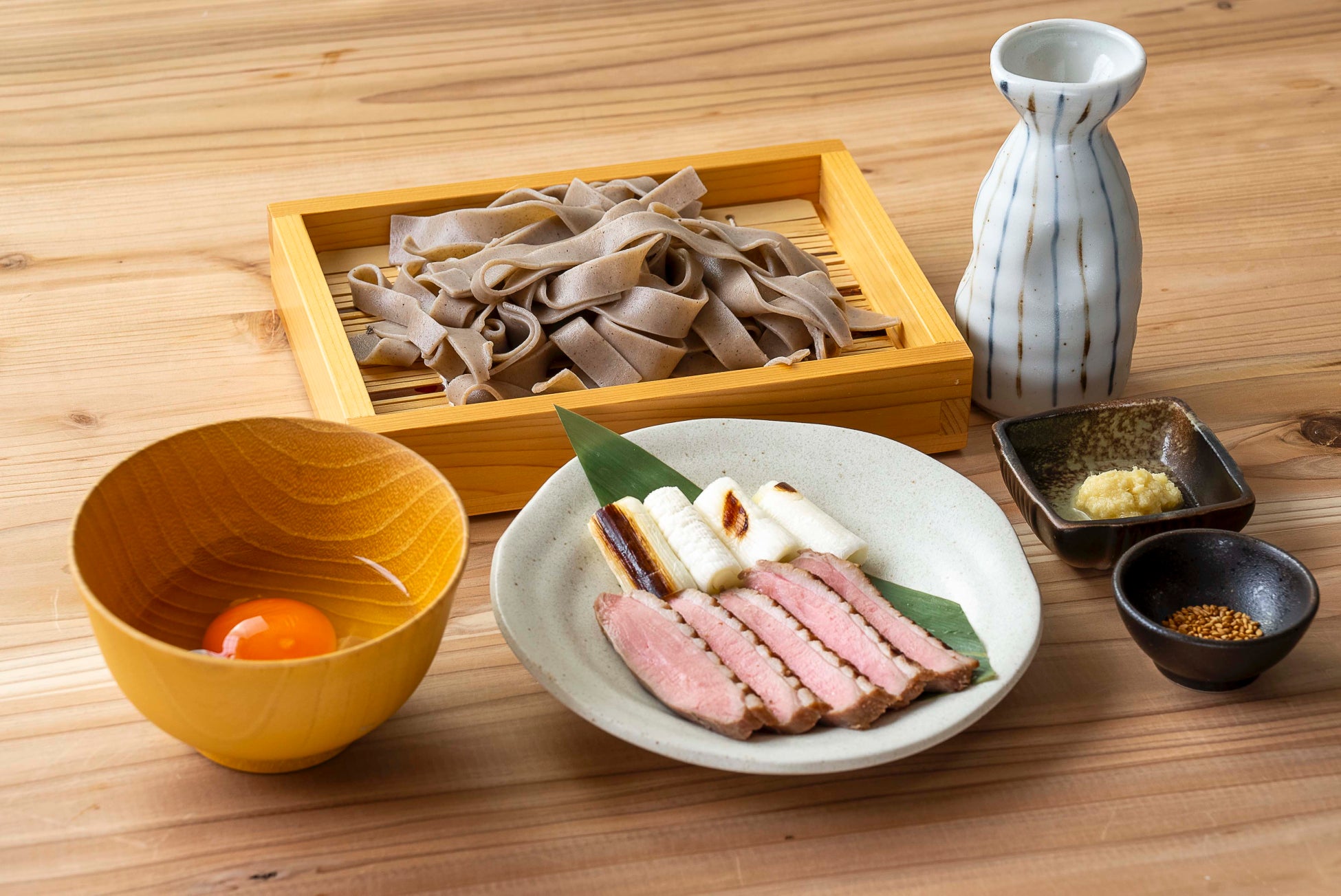 香ばしく焼きあげた甘みが特徴の深谷ネギと、低温でじっくり火を入れしっとり柔らかく仕上げた鴨肉。角谷養鶏場の濃厚な卵と熱々のそばつゆに入れてお召し上がりください。卵にそばつゆをかけた様子が地元の御嶽山(みたけやま)の夕焼けのように見えることから名付けました。