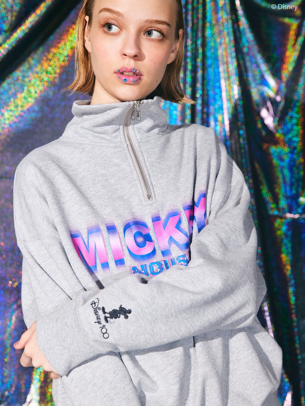 ディズニー創立100周年を祝した限定スウェットは、フロントに「Mickey Mouse」ロゴをネオンカラーのスプレー缶で描いたようなプリントを採用。袖口にはキャラクターシルエットを刺繍で施しました。