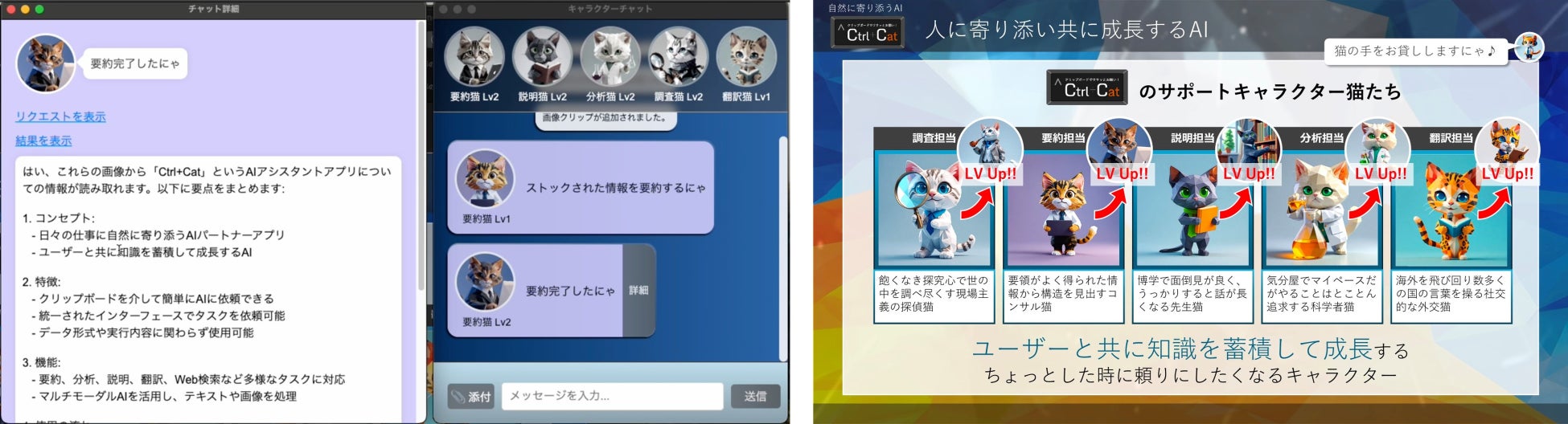 生成AIを活用したさまざまなツールが登場しているなか、タスクに応じたツールを起動し、それぞれを使い分ける手間が発生していることに着目しました。作業中のソフトウエアに関係なくクリップボードを介して生成AIへデータを受け渡すことができ、生成AIが実行したいタスクを推測、実行します。また、各タスクを処理する生成AIの機能をキャラクター化し、キャラクターがタスクを通じて成長していく様子を見せることで、協働作業をしている印象を作り出すとともに、利用者は自身の成長も実感できます。「Ctrl+Cat」では、入力データの変換、翻訳や分析などの処理、そしてキャラクター画像の作成に生成AIを活用しています。