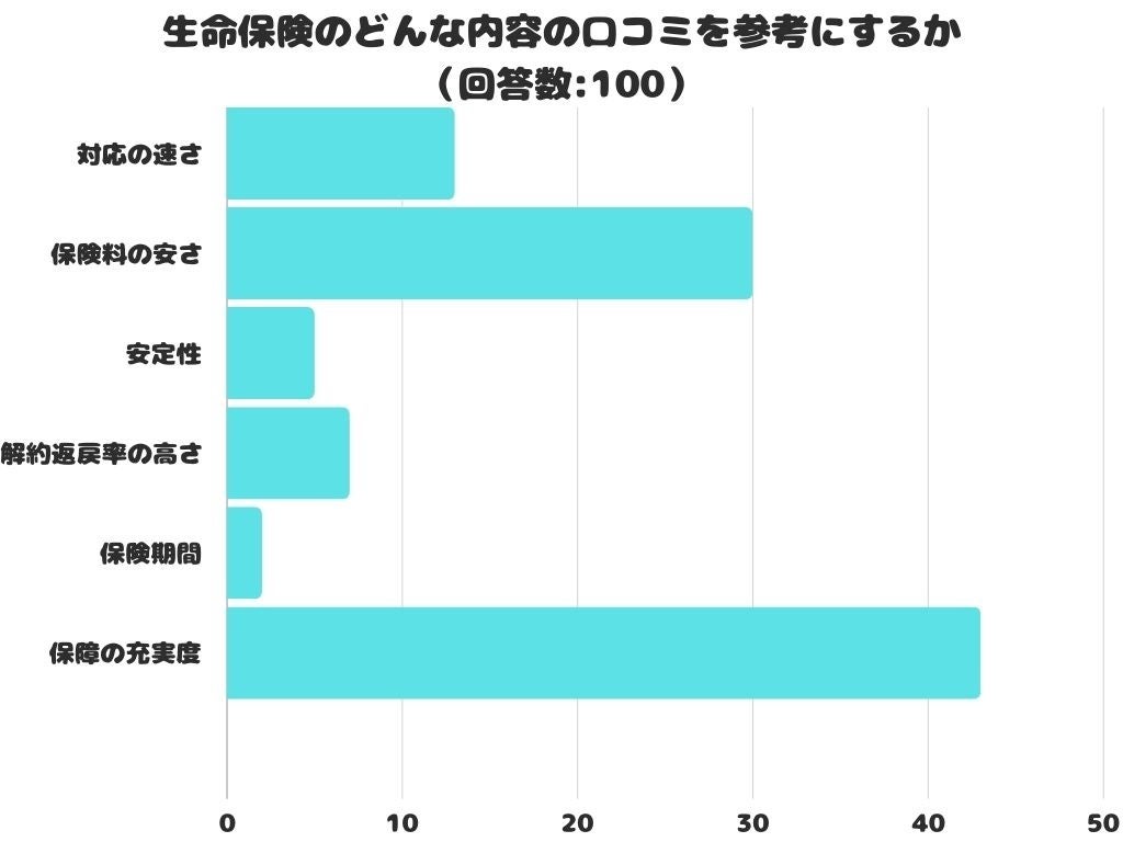 生命保険のどんな内容の口コミを参考にするかをアンケートにて調査したところ、1位は「保障の充実度」でした。