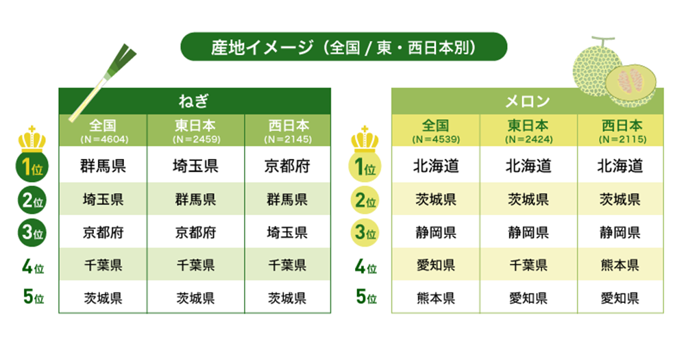 - 東日本と西日本で異なる“ねぎ”の産地イメージ。“メロン”は東西共通の結果に。