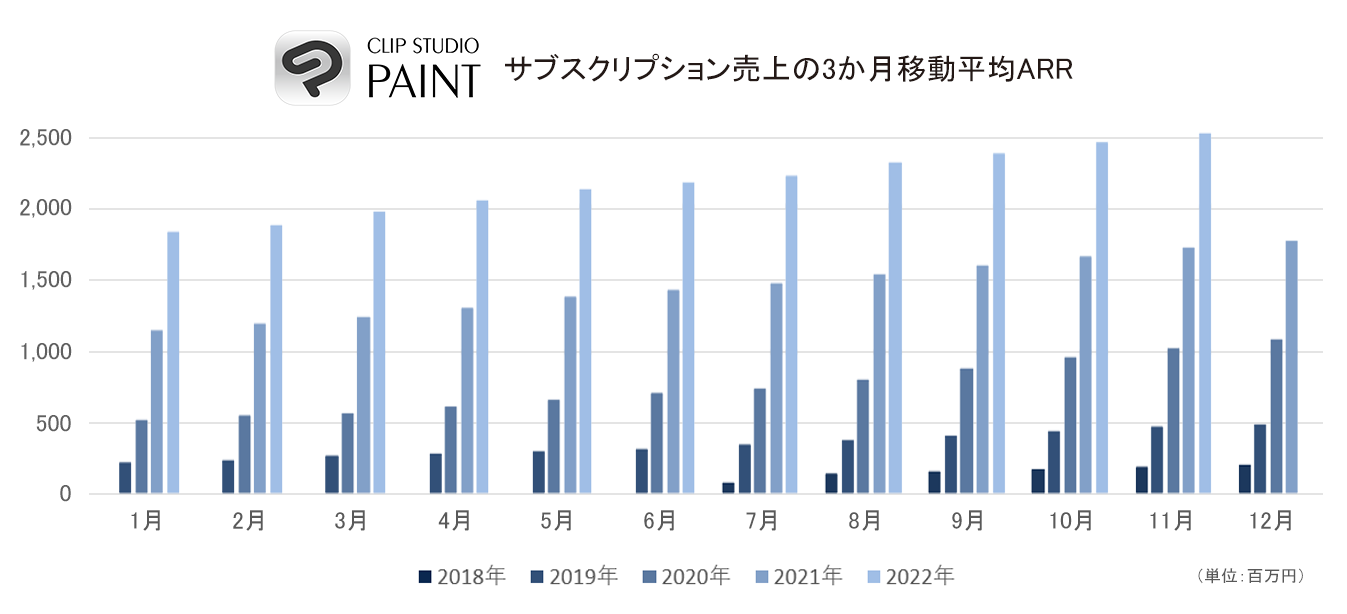 *1「CLIP STUDIO PAINT」が提供されている全てのプラットホームの総合計。iPhone版、iPad版、Galaxy版を除いた先行無償期間の契約および、アクティベーションコード(量販店等で販売する一意のコードのみが記載されているカード等サブスクリプションモデルのお支払に利用できる認証コードや、株主優待で利用されたアクティベーションコード)での契約を含む。