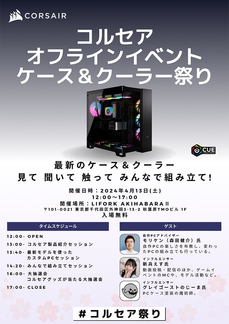 弊社取り扱いメーカーであるCORSAIR社は、2024年4月13日(土)、東京・LIFORK AKIHABARA IIにおいて、エコシステム「iCUE LINK」や最新製品を体験できるイベント「CORSAIR ケース&クーラー祭り」を開催いたします。