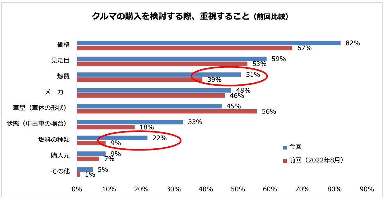 前回調査(2022年8月)の結果との比較では、「燃費」が12ポイント、「燃料の種類」が13ポイント上昇しました。ガソリン価格の高騰が影響したと推察されます。