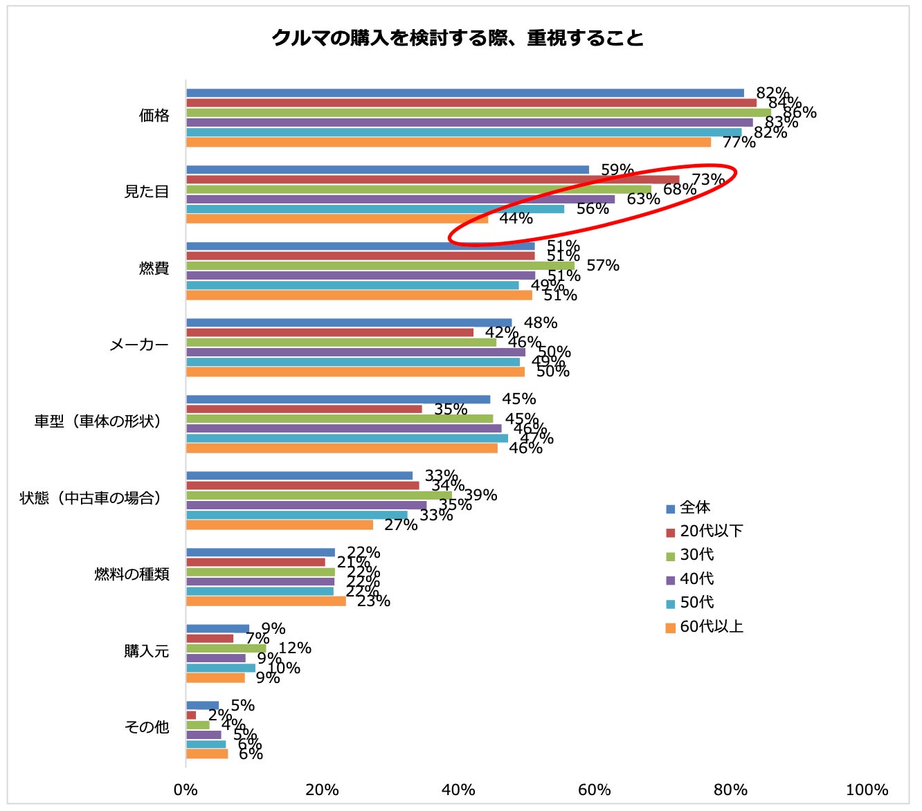 ① クルマの購入検討時に重視することは「価格」が最多。年代が下がるほど「見た目」を重視
