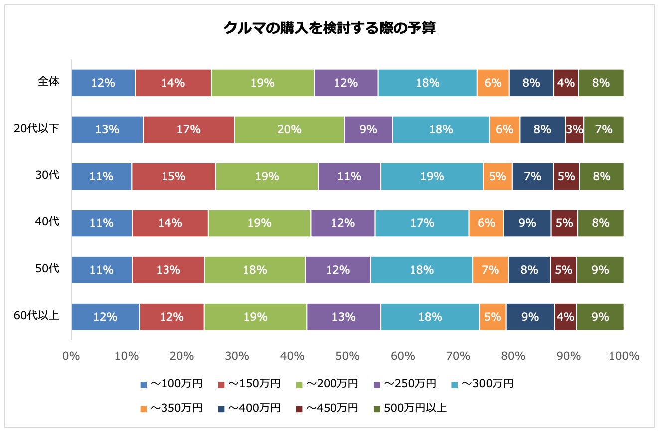 クルマの購入を検討する際の予算を尋ねると、「151~200万円以下」19%が最多で、「251~300万円以下」18%、「101万円~150万円以下」14%と続きました。500万円以上で購入を検討する人は1割を下回り、年代による大きな違いはありませんでした。