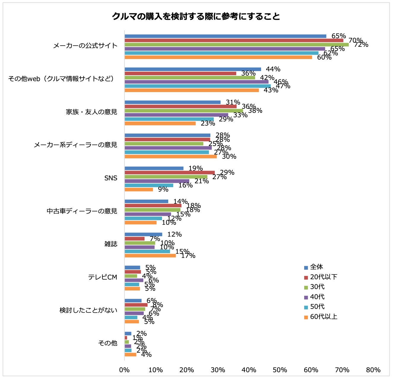クルマの購入検討時には65%が「メーカーの公式サイト」を参考にしており、唯一半数を超えました。次いで「その他Web」44%、「家族・友人の意見」31%となりました。