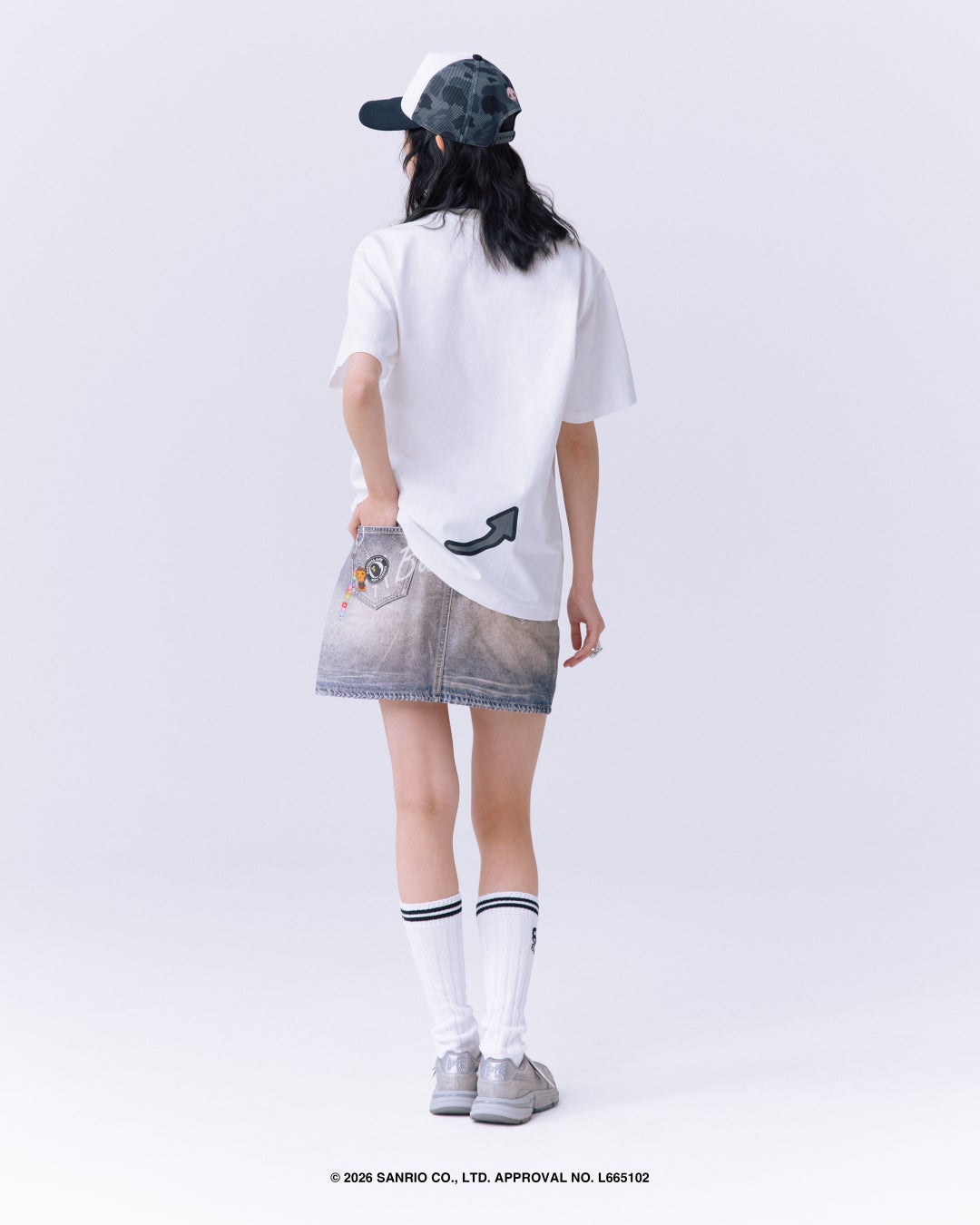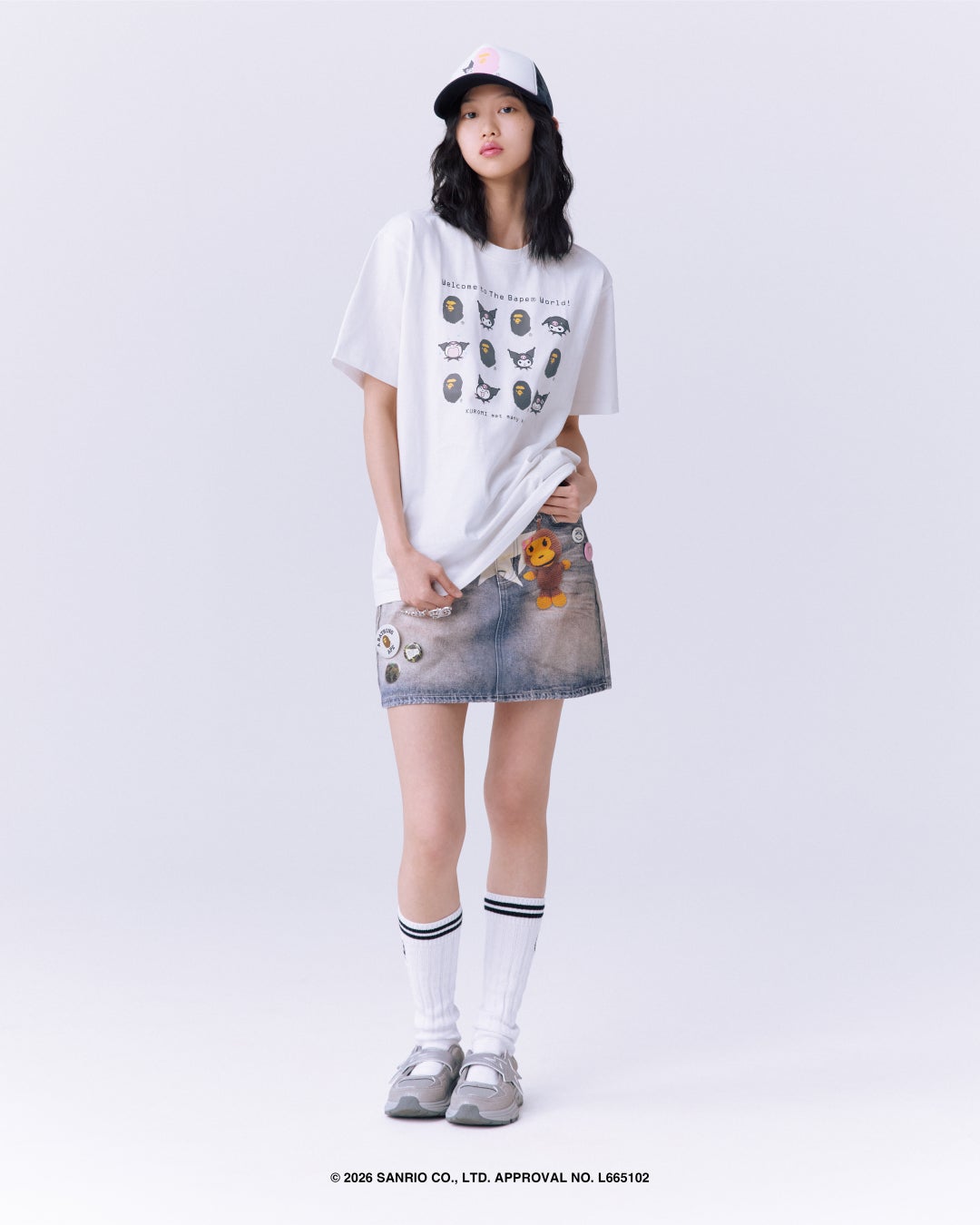 定番のカレッジグラフィックをベースに、キャラクターが遊ぶような配置でデザイン。MINI TEEシルエットを採用し、トレンド感とBAPE®の定番要素をバランス良く融合しています。