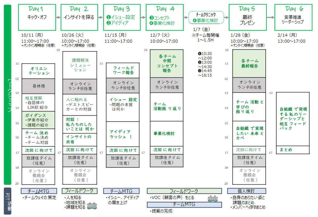 ・スケジュール:ワークショップDay1&2、5&6およびPJT活動のフィールドワークは伊東市内で実施