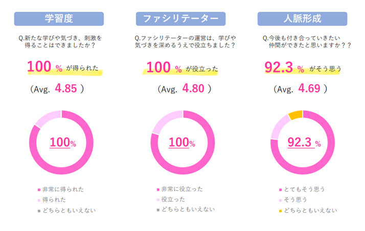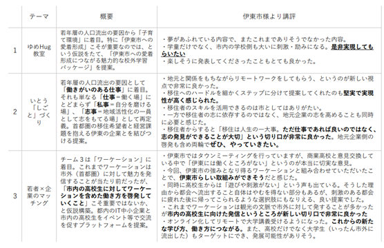 新たな学びや刺激による自己成長や人脈形成の観点から参加者の満足度は非常に高く、伊東市役所からも新たな切り口かつ実現性のある解決案という点など、高い評価をいただき具体化に向けて検討を進めています。