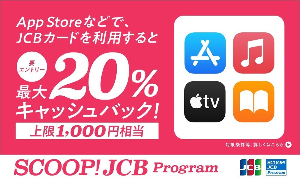 株式会社ジェーシービー (本社:東京都港区、代表取締役会長兼執行役員社長:浜川 一郎、以下:JCB)は、2022年12月16日(金)から2023年1月15日(日)まで、「Appleメディアサービスで対象のJCBカードを利用するとご利用代金より最大20%相当をキャッシュバック!」キャンペーンを実施します。