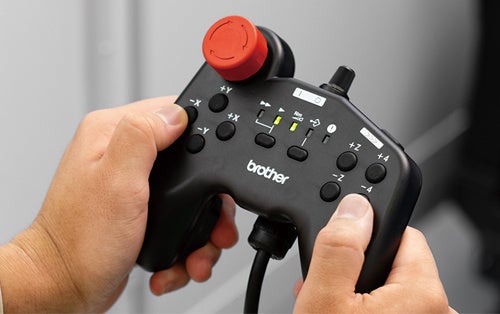 特に、ブラザー独自の機能として、加工経路の自動生成機能により、移動方向や速度の直感的な操作が可能なティーチングコントローラー(オプション)を使いながら、代表点を設定するだけで、加工経路を自動的に生成することができる。また、移動速度や力を抑える低トルク機能により、ミスが発生しても機械が異常な接触を検知して停止するため、故障のリスクを減らすことができる。