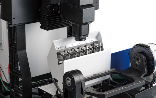 加えて、ピックアップ方式*2 ATC(自動工具交換装置)は、切削工具6本も収納できるため、バリの形状に合わせたバリ取り工具の選択が可能。また、開閉方式のカバーを採用することで、加工中に発生した切粉が工具室に侵入するのを防ぐことができる。