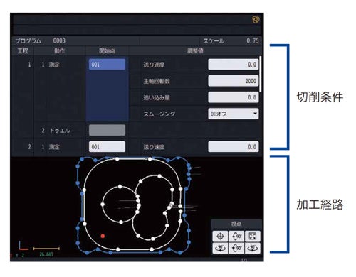 また、自動生成された加工経路は、タッチパネルで修正したい箇所を選択し、補正量を入力するだけで、経路や条件を修正することができる。