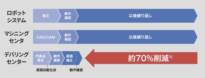 ロボットやNC加工機では、加工経路を作成する際、再設定(再教示)作業やNCプログラム修正を繰り返すため、多くの時間を要する。一方、デバリングセンターDG-1はこれらの作業が不要になるため、加工の立ち上げ時間を約70%短縮することが可能になる。