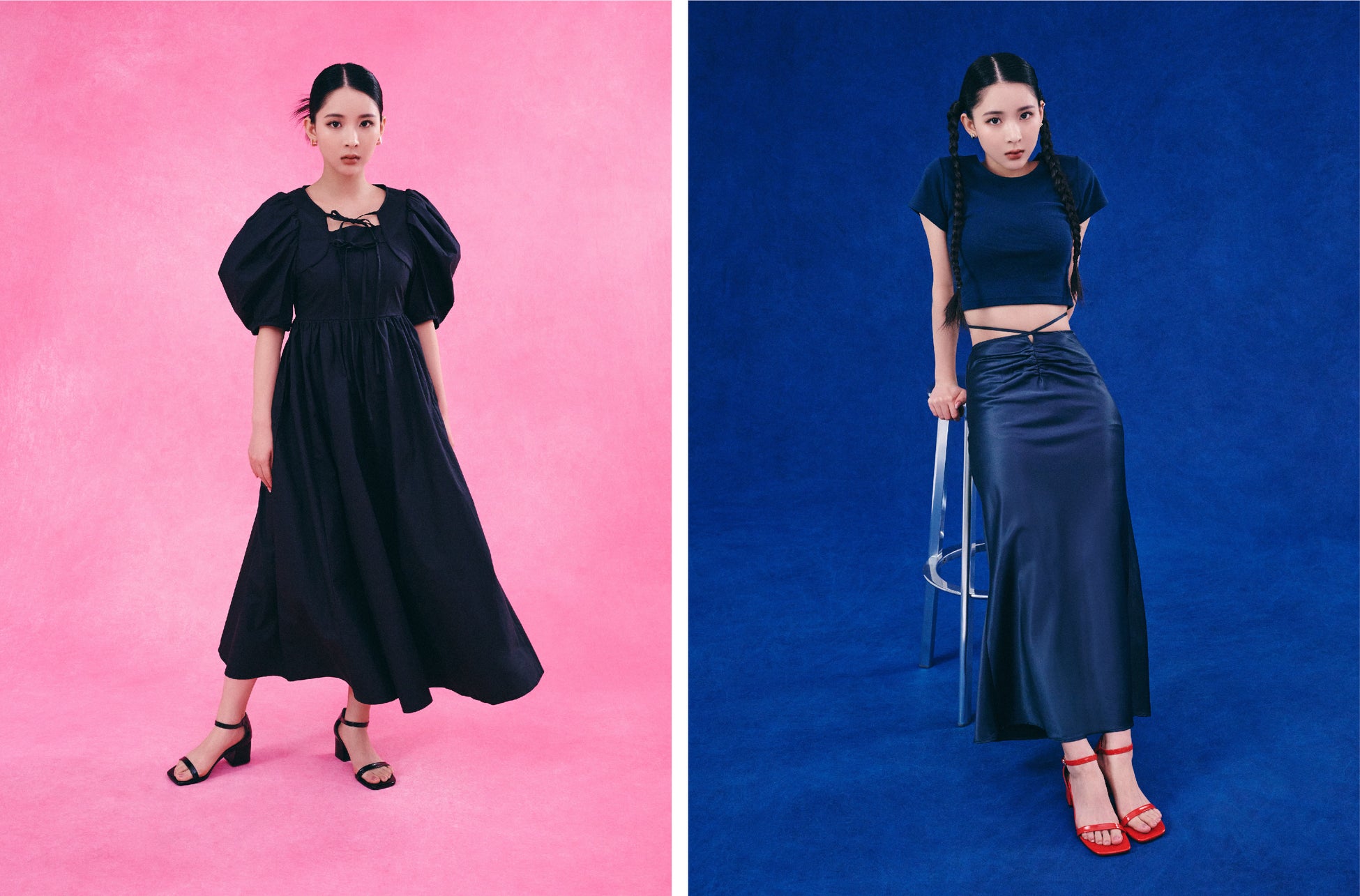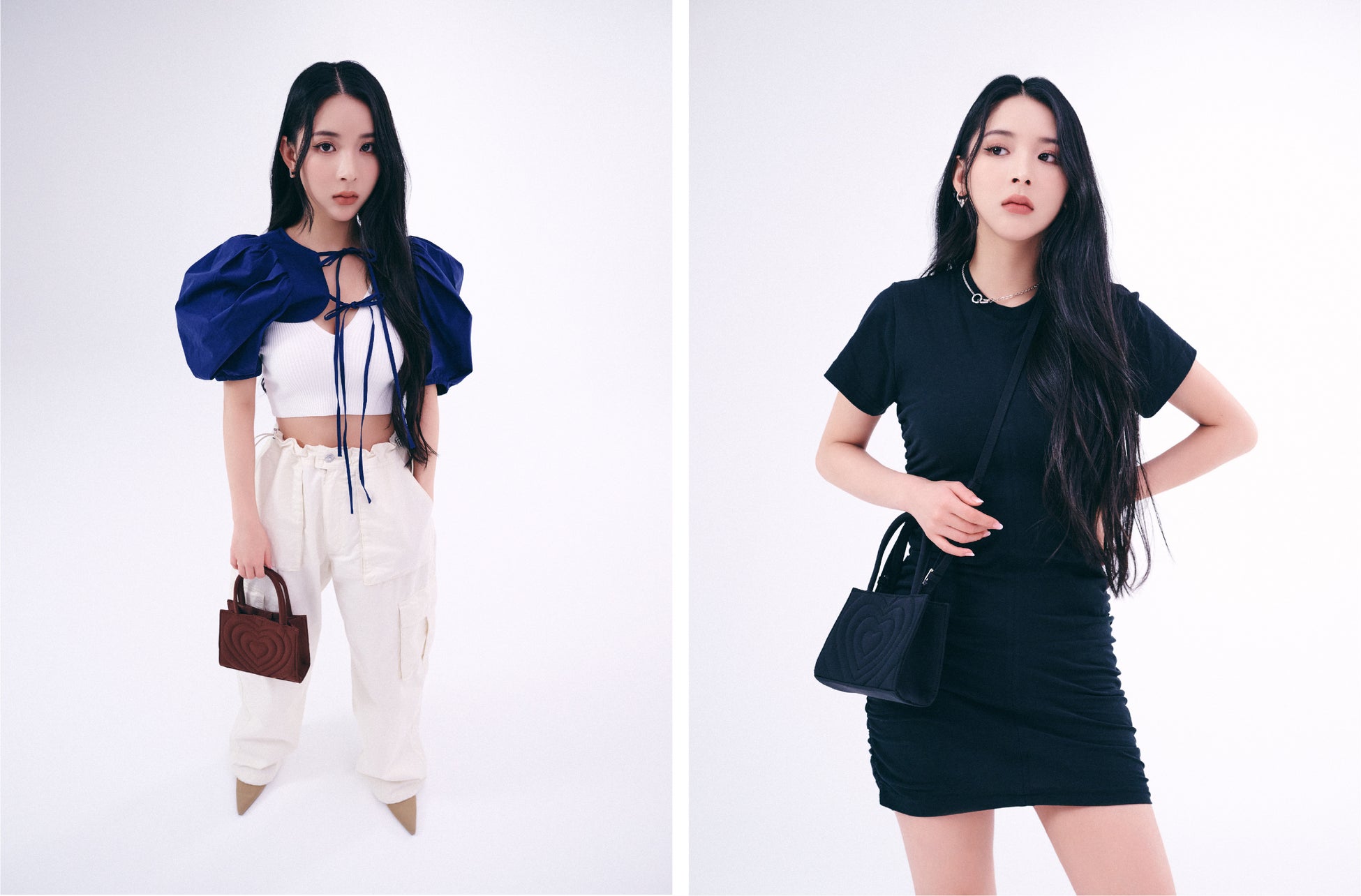 Y2Kをキーワードに構成された本コレクションは、クロップド丈のTシャツやウエストのスピンドルで自由なウエスト位置で穿けるカーゴパンツ、サイドに施されたシャーリングディテールが女性らしいタイトワンピースや前後2WAYで着用可能なスカート、ボレロとキャミワンピースのセット、カーゴパンツと色味を合わせて作られたパンプス、ハートの刺繍が目をひくバッグの全8アイテムが揃います。