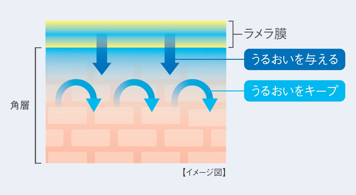 乾燥によりキメの乱れた肌に密着し、肌表面を整えるラメラ膜を形成。うるおいを与え、乾燥も防ぐことでうるおったなめらかな美肌に導きます。