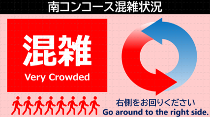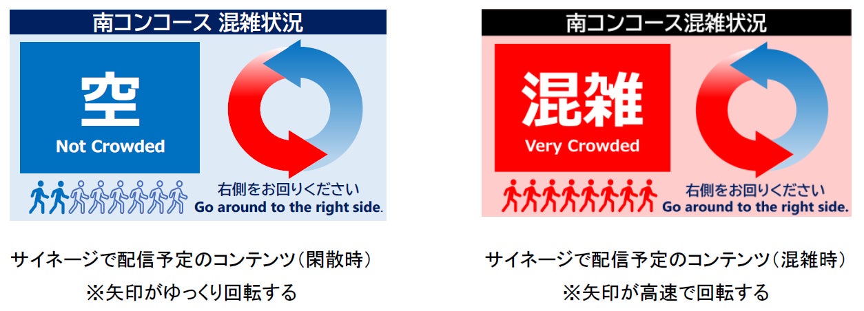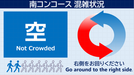 ・より多くのお客さまにラウンドアバウト歩行を認識いただくため、視界に入る位置にデジタルサイネージを設置し、混雑度に応じて案内サインが変化するコンテンツを表示します。