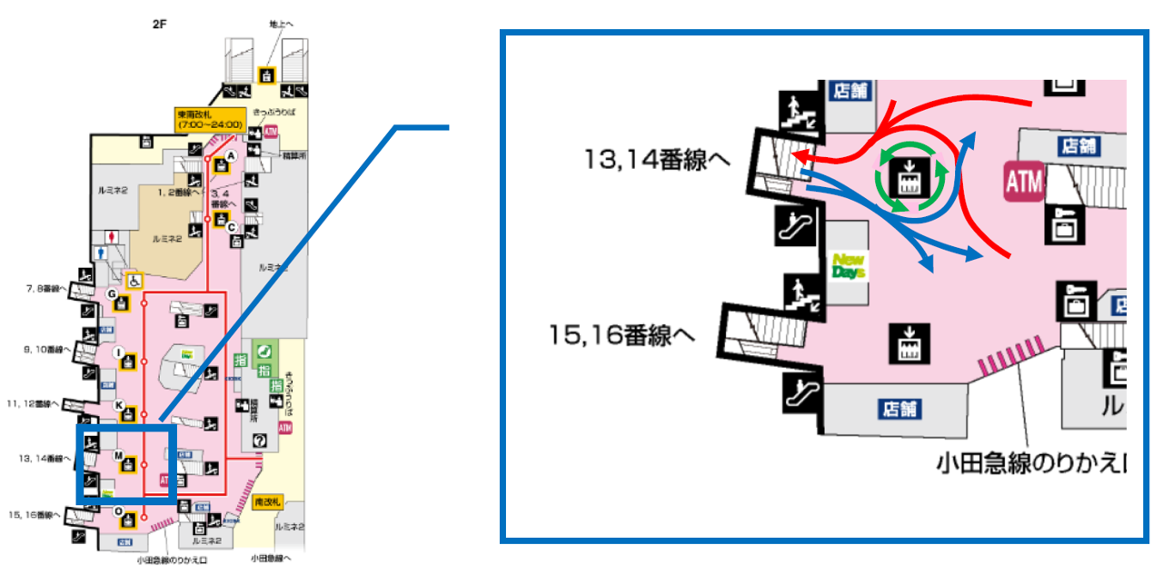 前回同様、13・14番線からのお客さまと小田急線乗換口からのお客さまが交錯しないよう、エレベーターを中心に反時計回りに一方通行(ラウンドアバウト)となる実証実験を行います。