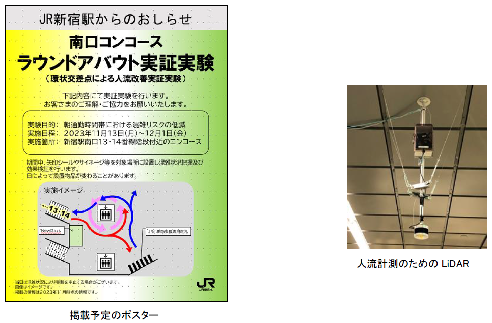 ○JR東日本では、産学連携でのイノベーション創出をめざし、西成 活裕氏(東京大学大学院工学系研究科教授)と連携し、群集マネジメント学を活用した混雑リスク低減に向けた取り組みを進めています。 ○今年7月10日~7月12日に、朝通勤時間帯における、お客さまの安全でスムーズな通行をめざし、新宿駅南口13・14番線階段付近のコンコースにおいて、ラウンドアバウト※実証実験を実施しました。 ○7月の実証実験の検証結果を踏まえ、手法を変更し、11月15日~12月1日の17日間、同エリアにおいてラウンドアバウト実証実験第2弾を行います。 |
