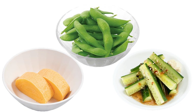 “だし巻き玉子”“枝豆”“きゅうり香味醤油だれマヨ”の3点セットです。ビールと一緒に楽しむほか、箸休めにもぴったりです。