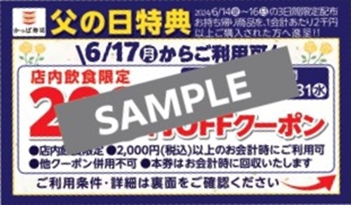 ・内 容:期間中にご来店または WEB にてお持ち帰り商品を税込 2,000 円以上ご購入・お受け取りいただいた方に、 2024 年 6 月 17 日(月)~7 月 31 日(水)の期間にご利用いただける店内飲食限定税込 200 円 OFF クーポンを進呈いたします。