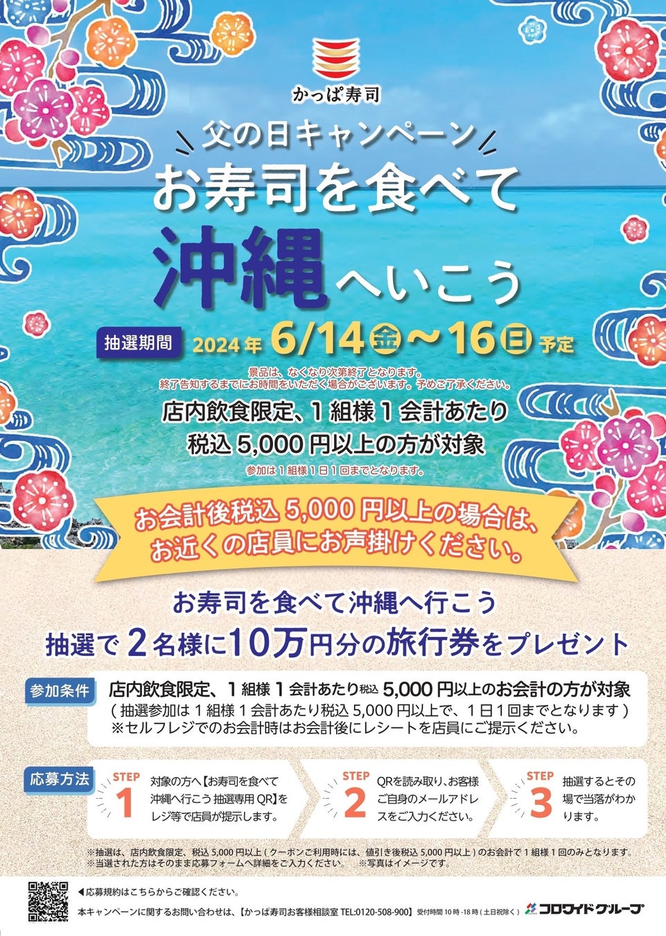 1 つ目は、「お寿司を食べて沖縄にいこう」と題して、店内飲食限定で1組様1会計あたり税込5,000円以上のお会計の方を対象に、抽選で2名様に10万円分の旅行券をプレゼントいたします。
