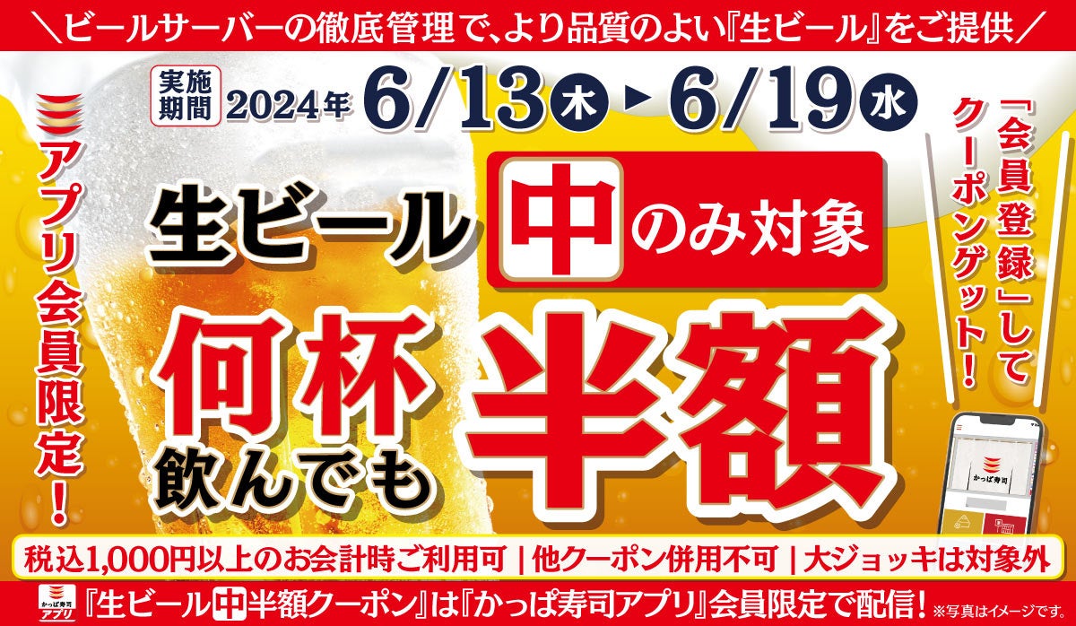 コロワイドグループのかっぱ寿司(カッパ・クリエイト㈱ 本社:神奈川県横浜市、代表取締役社長:山角豪)は、2024年6月13日(木)~6月19日(水)の期間、かっぱ寿司全店で利用できる『生ビール(中)半額クーポン』をかっぱ寿司アプリ会員に配信いたします。また、6月16日の「父の日」に合わせて、旅行券が当たるキャンペーンや限定セットの販売、特典クーポンの配布も実施いたします。