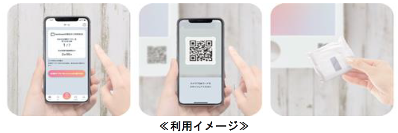 ②アプリを起動し、設置しているディスペンサーにスマートフォンをかざし生理用品を受け取る(1回1枚|無