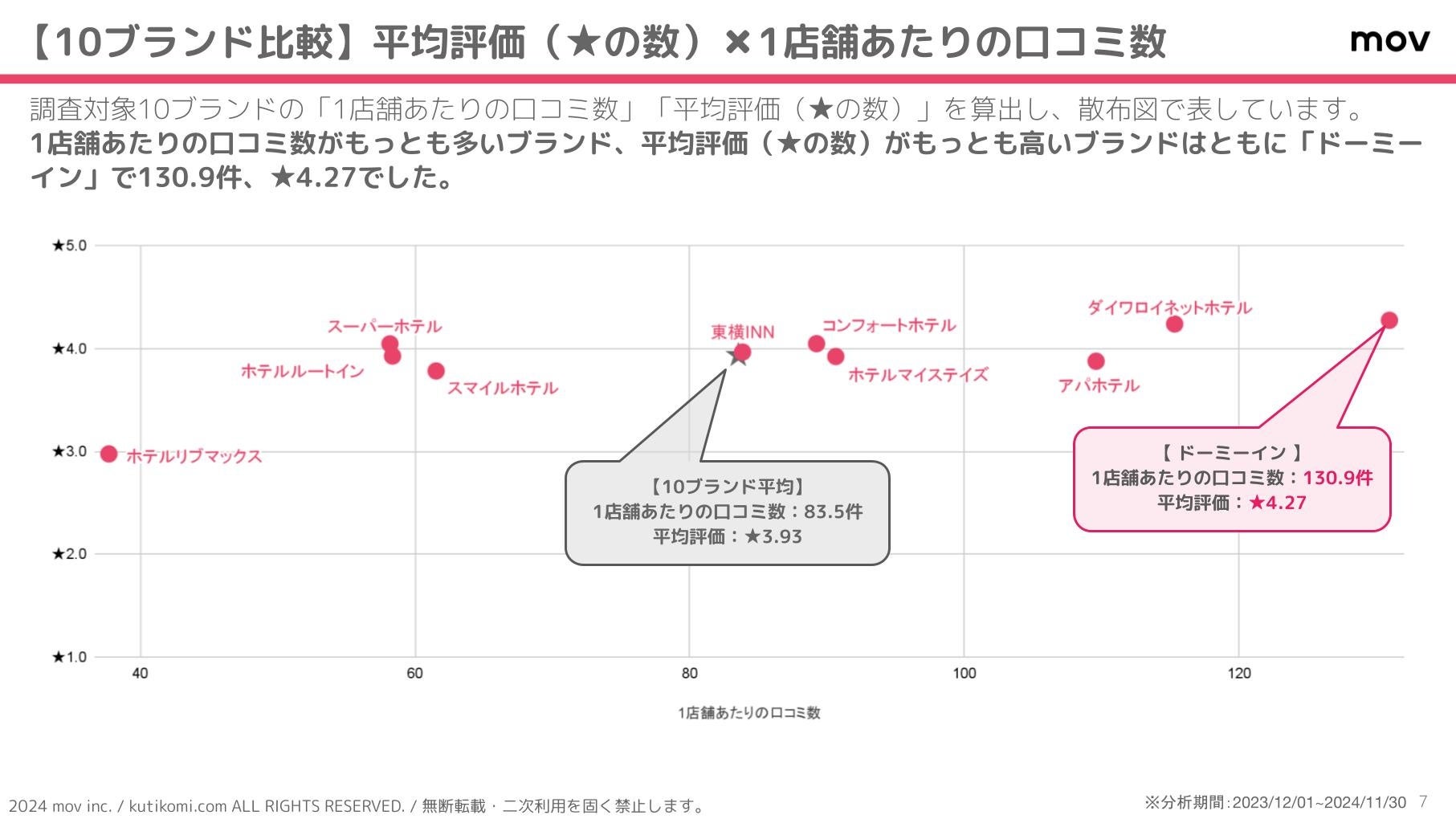 こちらの散布図では、調査対象10ブランドの「1店舗あたりの口コミ数」「平均評価(★の数)」を算出しています。1店舗あたりの口コミ数がもっとも多いブランド、平均評価(★の数)がもっとも高いブランドはともに「ドーミーイン」で130.9件、★4.27でした。