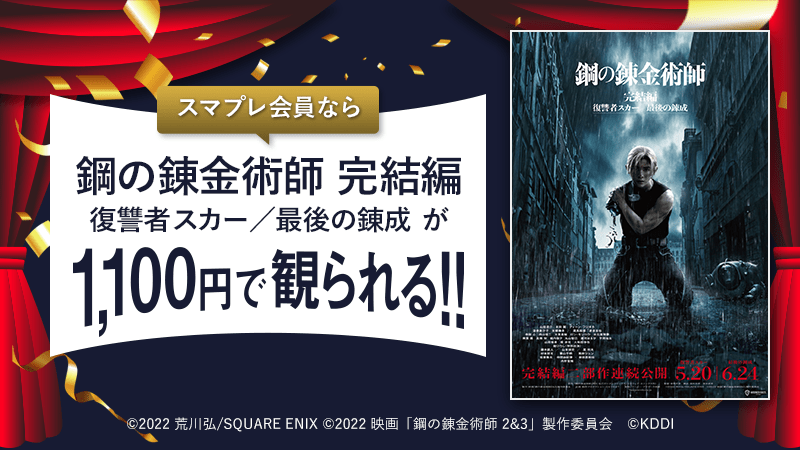 第1弾は、2022年5月20日(金)公開の映画『鋼の錬金術師 完結編 復讐者スカー』、6月24日(金)『鋼の錬金術師 完結編 最後の錬成』でご利用いただけます。 『鋼の錬金術師 完結編 復讐者スカー/最後の錬成』の2部作は、連載20周年を記念したプロジェクトで、原作の最終話までを描く“実写映画”完結編として、この春話題の映画作品の1つです。