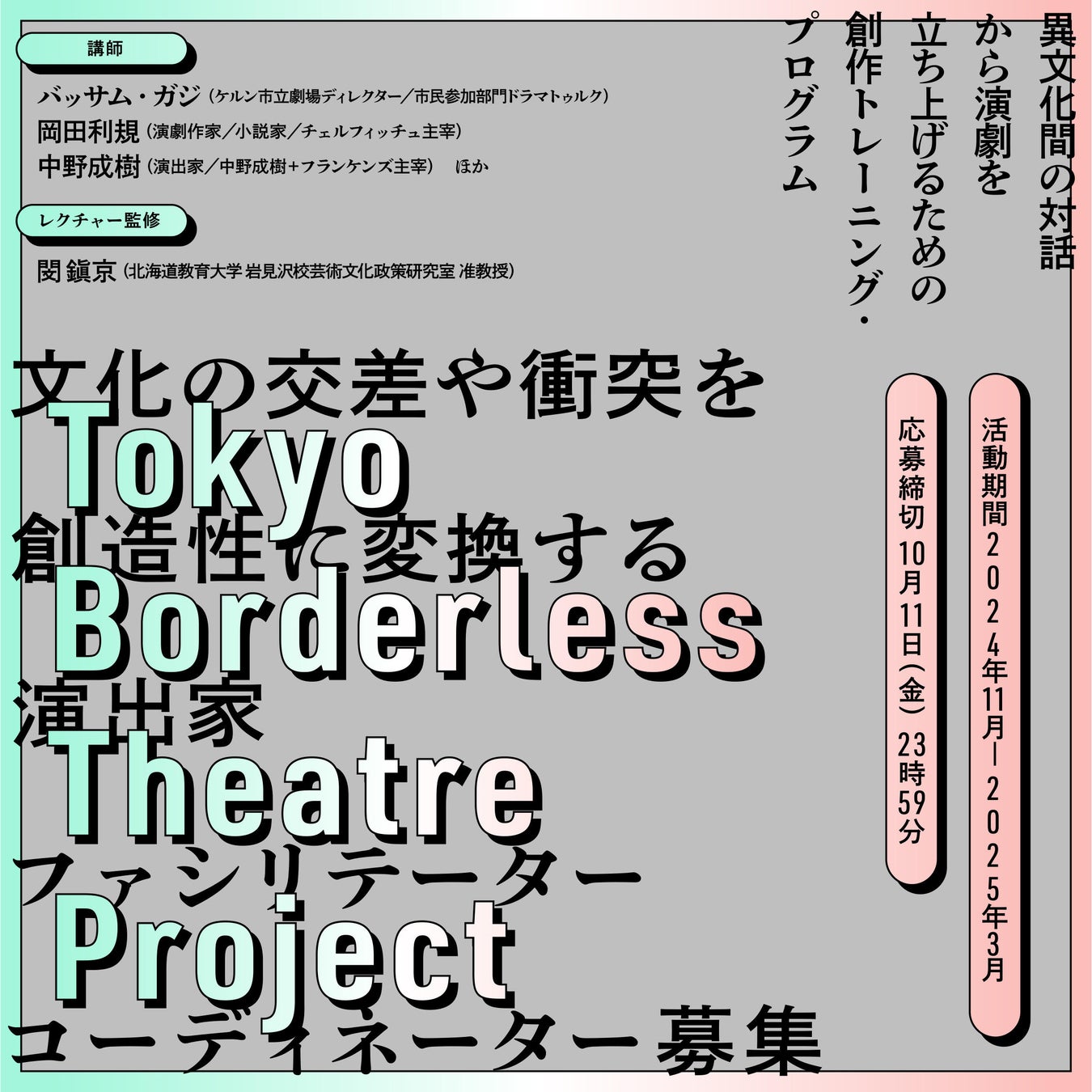 【東京芸術劇場】「Tokyo Borderless Theatre Project」文化の交差や衝突を創造性に変換する演出家/ファシリテーター/コーディネーター募集!