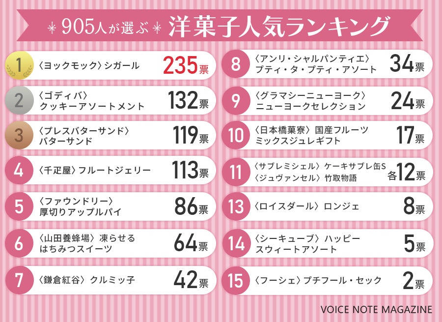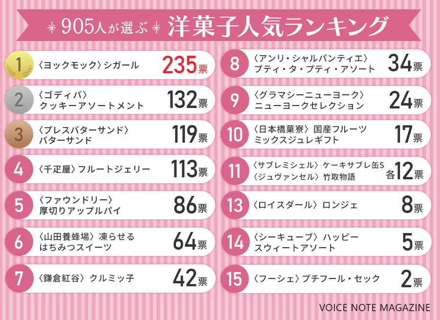 今回はそんな長い歴史を持つ洋菓子に関するアンケートを実施。905人のボイスノート会員に好きな洋菓子を選んでもらった結果をランキング形式でご紹介します。