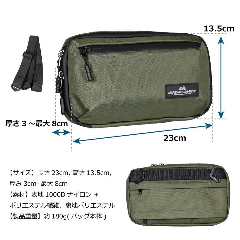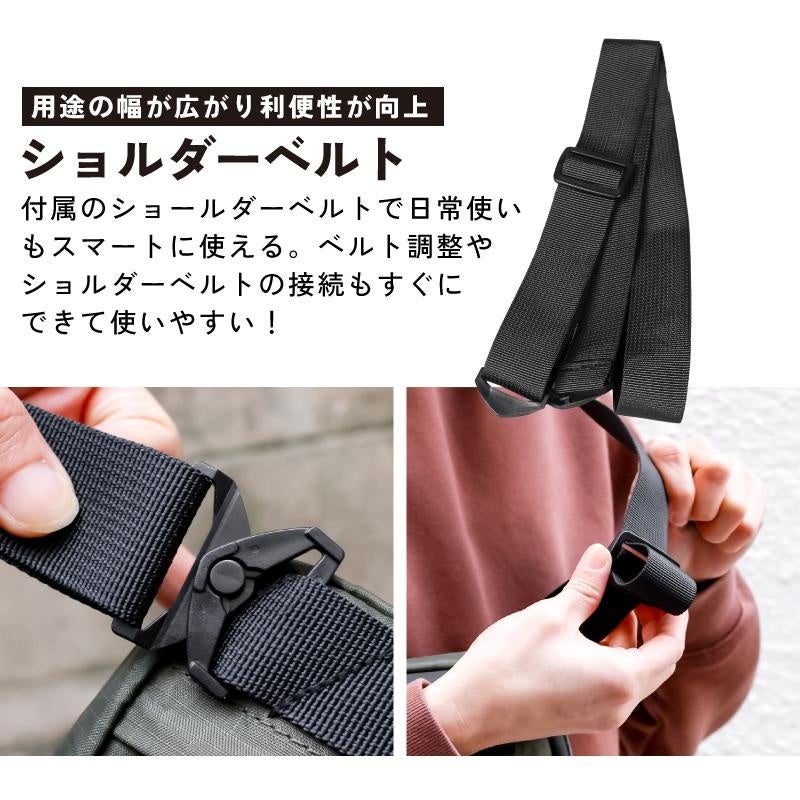 ベルクロベルトによる三点固定、内蔵式ベルクロベルト、撥水性表地・防水ファスナー、ハンドルバッグ&ショルダーポーチの2WAY |