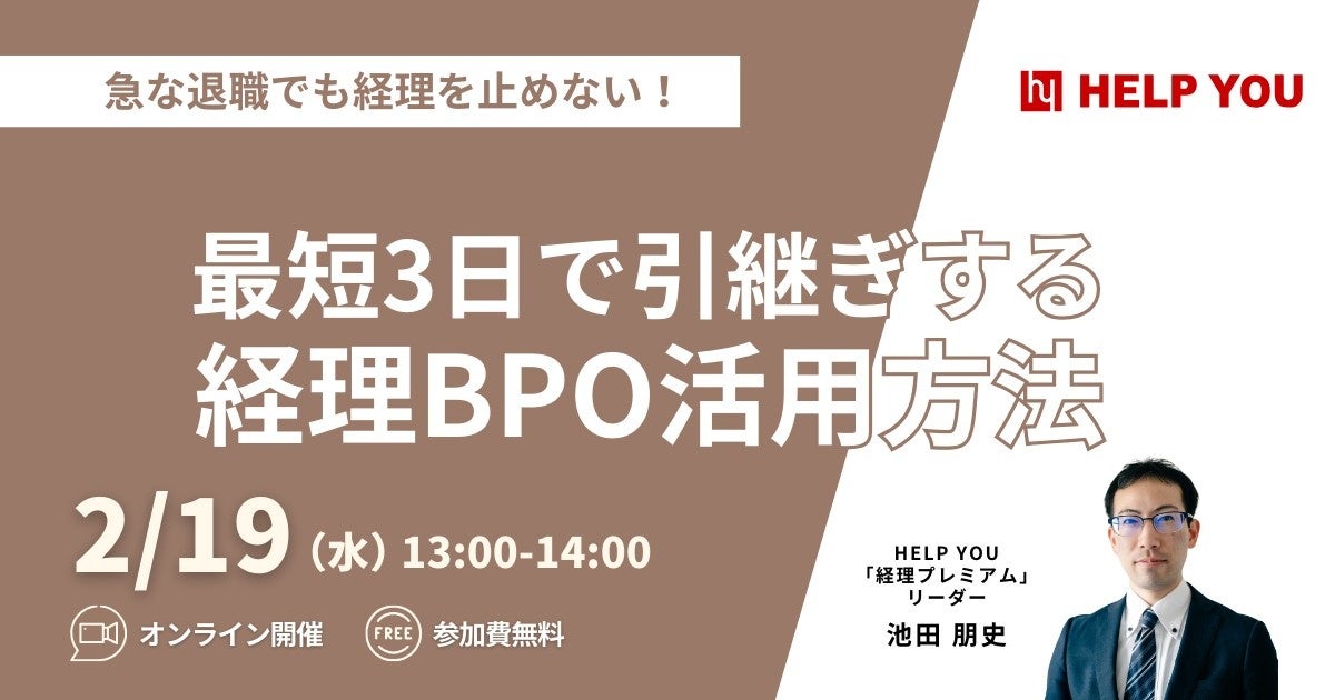 このたび、令和7年2月19日(水)13:00より、経理部門を管理する方々が抱える「急な人員不足」や「業務の継続性」といった課題に対する解決策を考えるセミナーを開催いたします。短期間での業務引き継ぎを実現する方法や、必要な準備、社内対応と外部リソース活用の比較などを、経験豊富な経理プロフェッショナルが具体的に解説します。