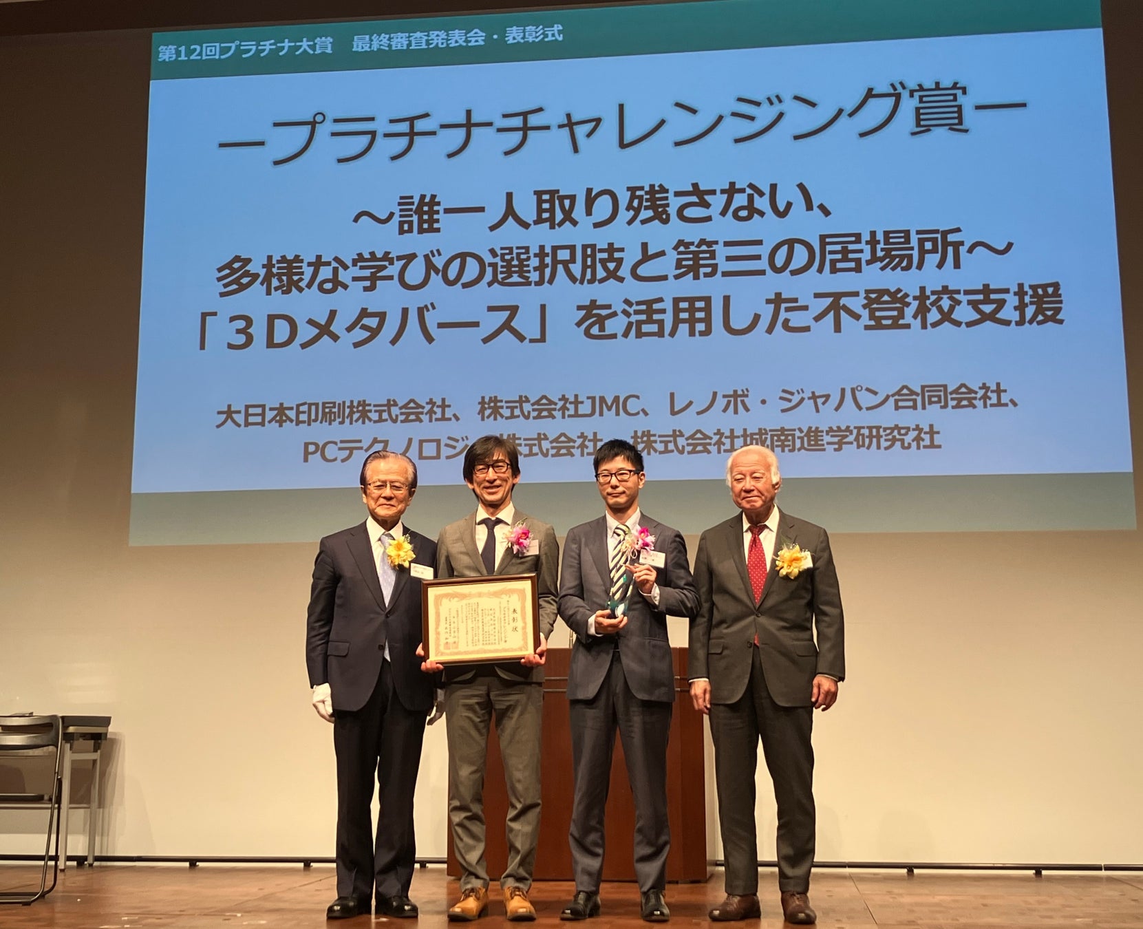 大日本印刷株式会社(DNP)は、一般社団法人プラチナ構想ネットワークが主催する「第12回プラチナ大賞」において、DNPが提供する「メタバース空間を利用したラーニングシステム」*1で「プラチナチャレンジング賞」をパートナー企業(レノボ・ジャパン合同会社、株式会社JMC、PCテクノロジー株式会社、株式会社城南進学研究社)と共同で受賞しました。この表彰式は、2024年11月6日(水)に行われました。