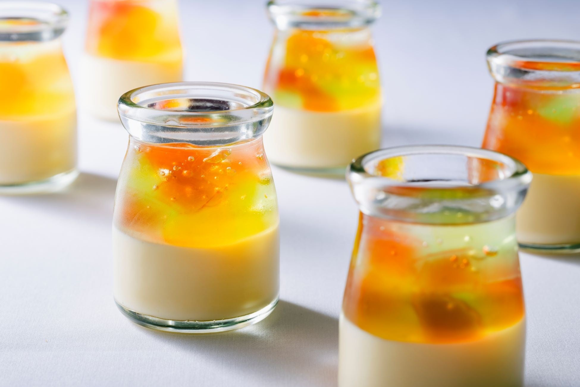 ミルクプリンにカラフルなゼリーで層を作り、まるでステンドグラスのような美しいデザートに仕上げました。ゼリーの鮮やかな色彩とミルクプリンの滑らかな味わいが絶妙にマッチし、見た目も味も楽しめる一品です。