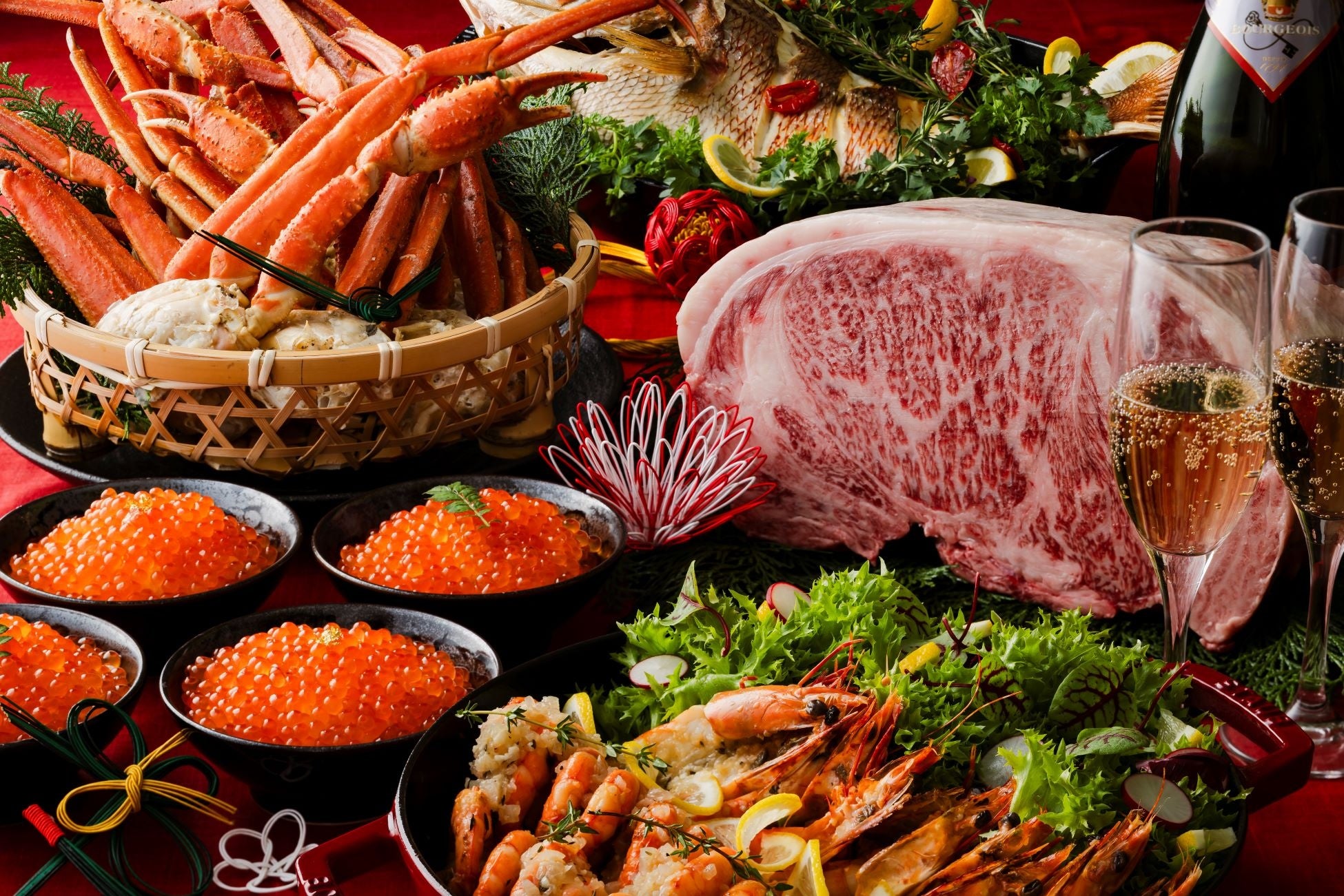 ホテルで過ごす年末年始は、黒毛和牛ステーキや蒸しズワイガニ、イクラ丼、瀬戸内産 真鯛の丸ごと香草焼きなど選び抜かれた豪華グルメの共演。お正月らしく華やかな料理で、慶びにあふれる新年をお迎えいただけます。