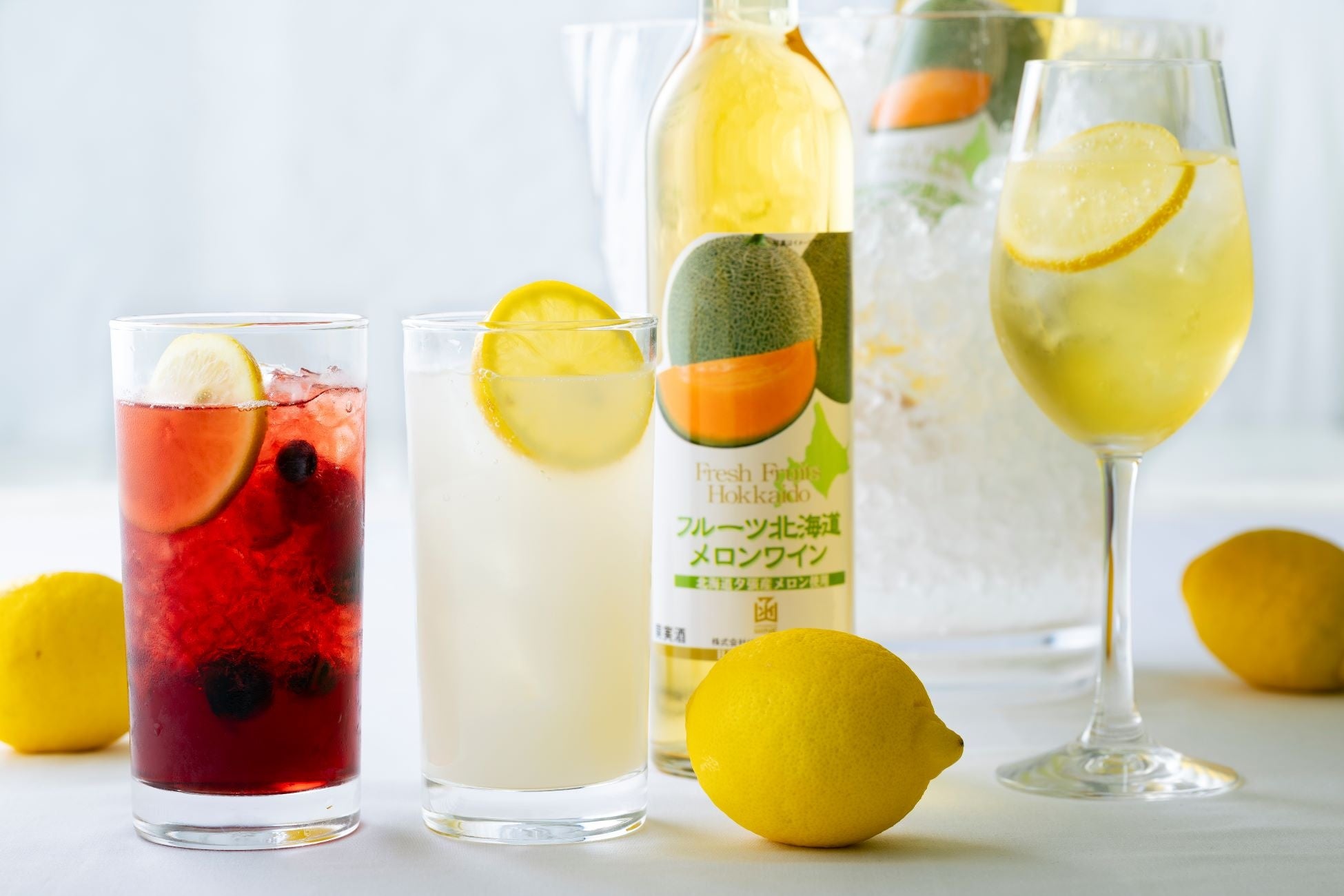 北海道メロンワインのスプリッツァー、北海道白いレモンサワー、ハスカップとローズヒップのビネガードリンク(ノンアルコール)