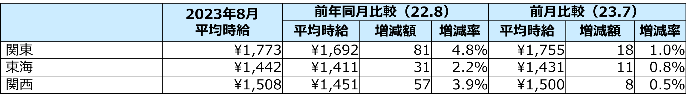 8月度のエリア別平均時給は、全エリアで前年同月比、前月比プラスを記録。