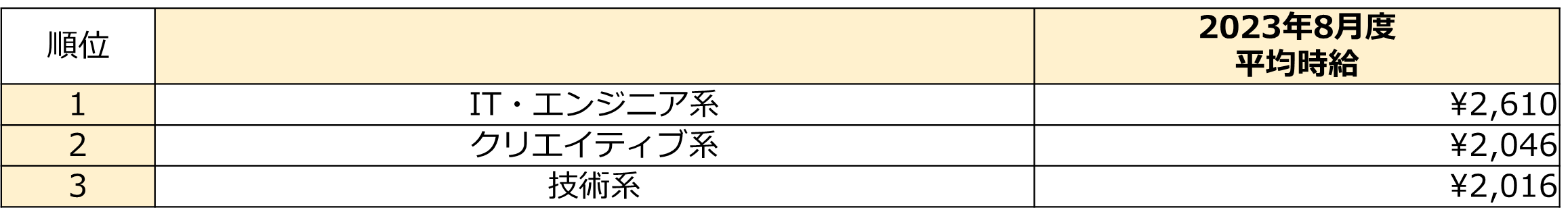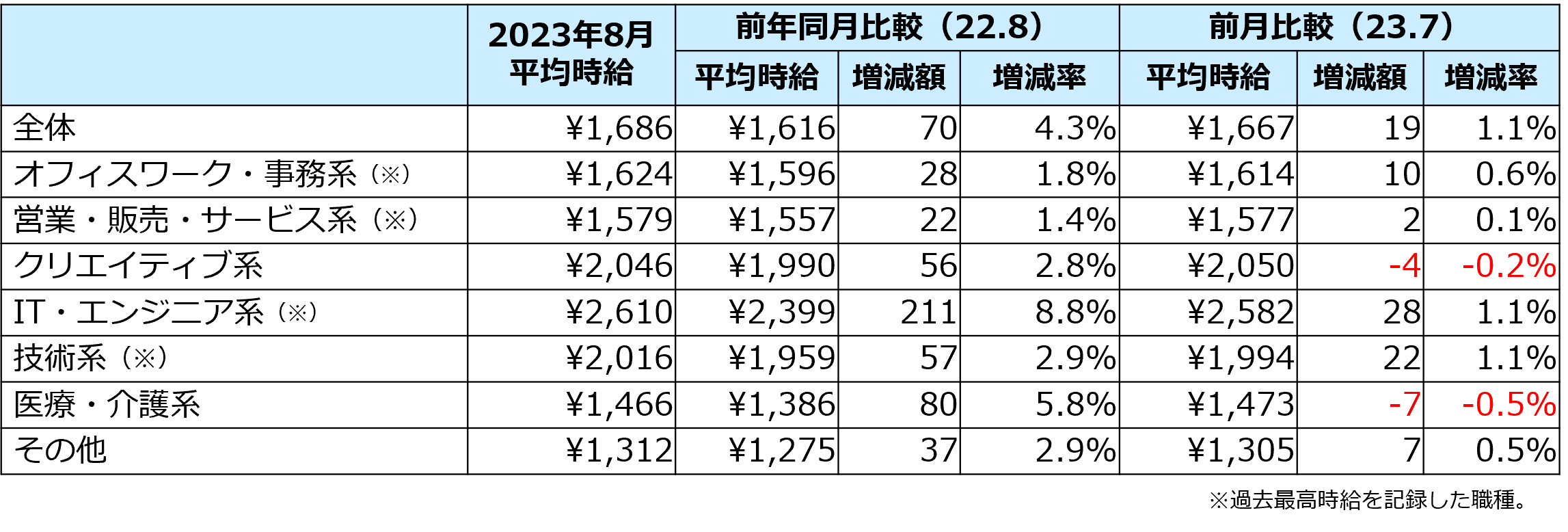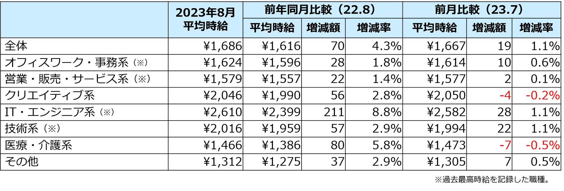 8月度の三大都市圏職種別平均時給は、4職種で過去最高時給を記録。