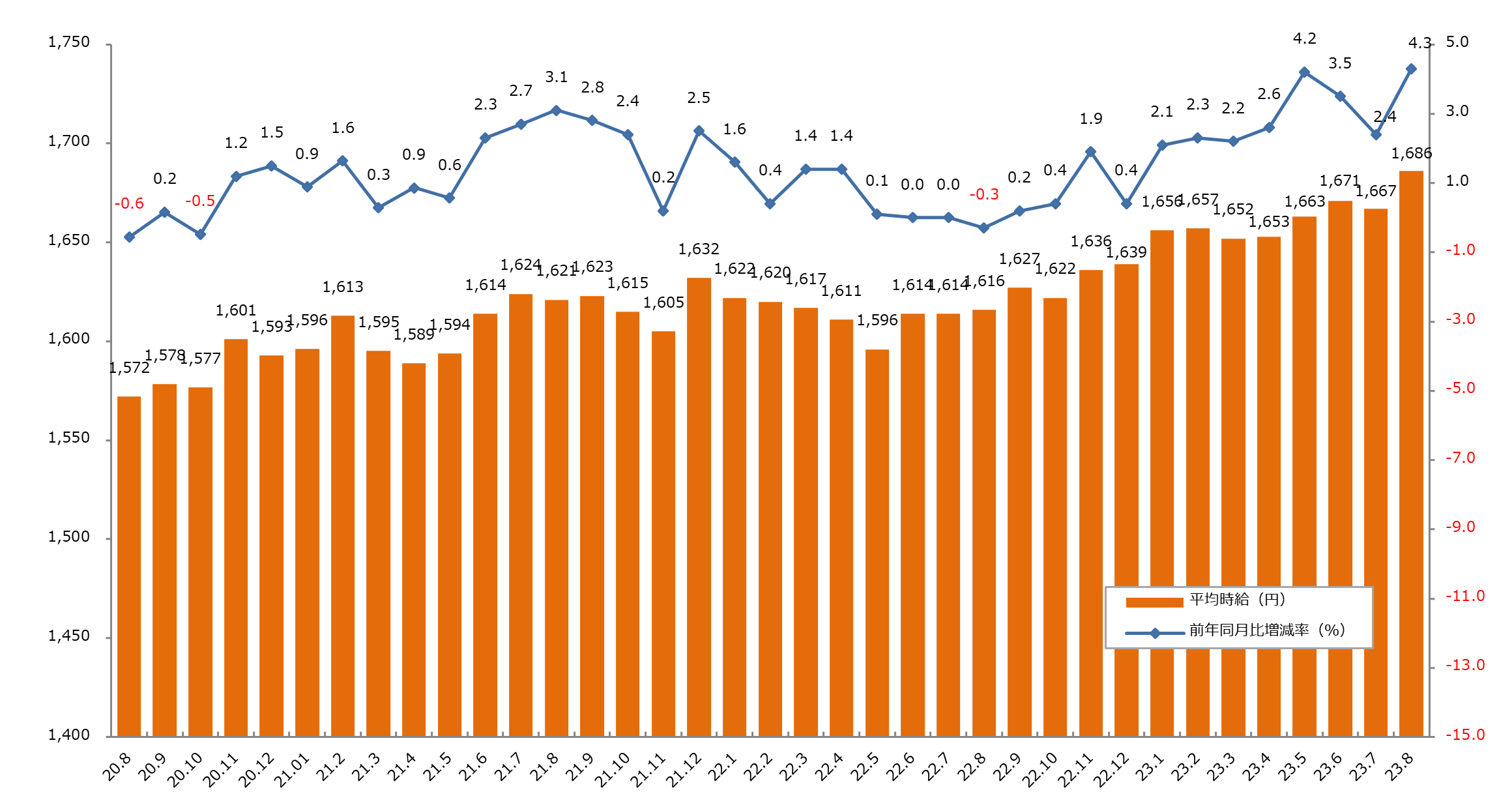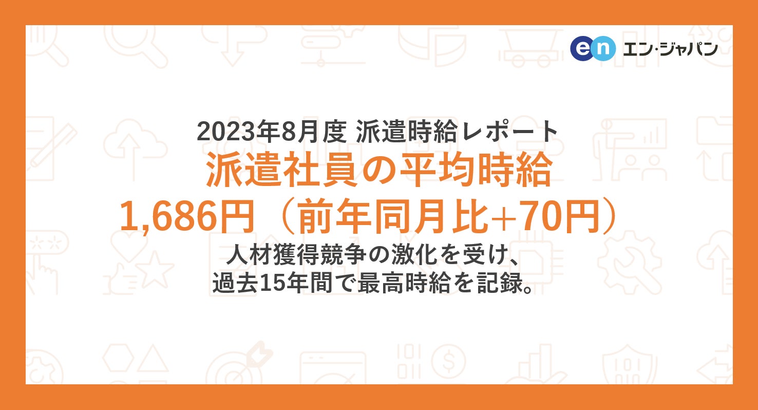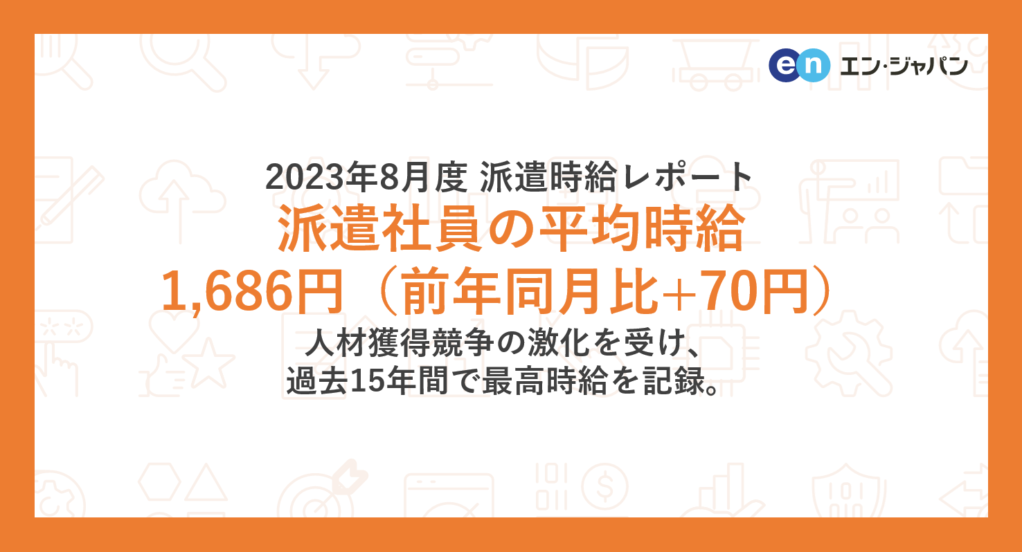 2023年8月度 派遣社員の平均時給は1,686円人材獲得競争の激化を受け、過去15年間で最高時給を更新。