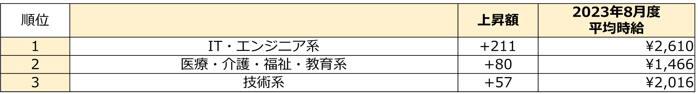 8月度の職種別/前年同月比 時給上昇額ランキング