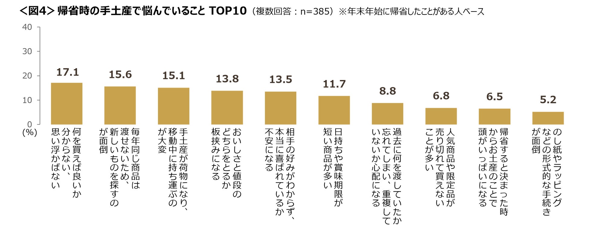 帰省時の手土産の悩みは、「何を買えばよいか分からない、思い浮かばない」「毎年同じ商品は渡せないため、新しいものを探すのが面倒」「手土産が荷物になり、移動中に持ち運ぶのが大変」「おいしさと値段のどちらをとるか板挟みになる」「相手の好みがわからず、本当に喜ばれているか不安になる」が上位。<図4>