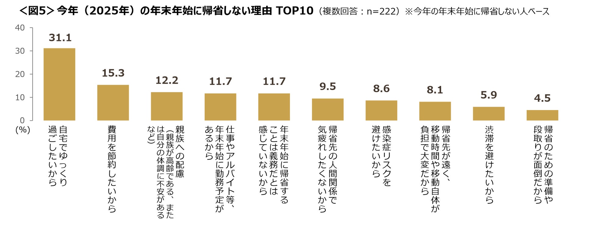 今年の年末年始に帰省しない理由は、「自宅でゆっくり過ごしたいから」が31.1%と高く、休息を優先させたい意向が強い。<図5>